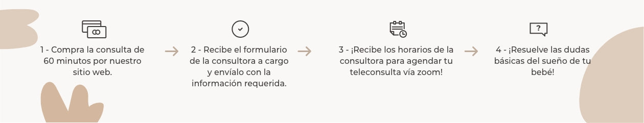 Llamado por videollamada bajo la plataforma zoom de 60 minutos, donde abarcamos el problema que esta interrumpiendo el sueño de tu hijo y cómo solucionarlo dentro de las posibilidades reales (No enseñamos en esta consulta el dormir independiente ni a sacar muletillas)